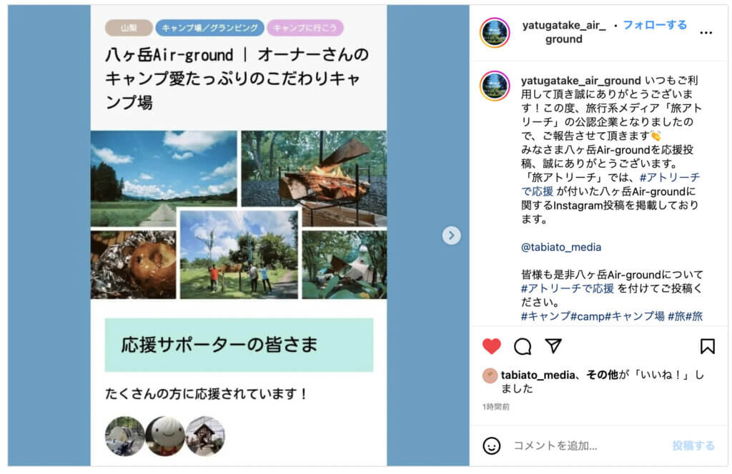 山梨県のキャンプ場「八ヶ岳Air-ground」様に、旅アトリーチの公認企業になっていただきました。